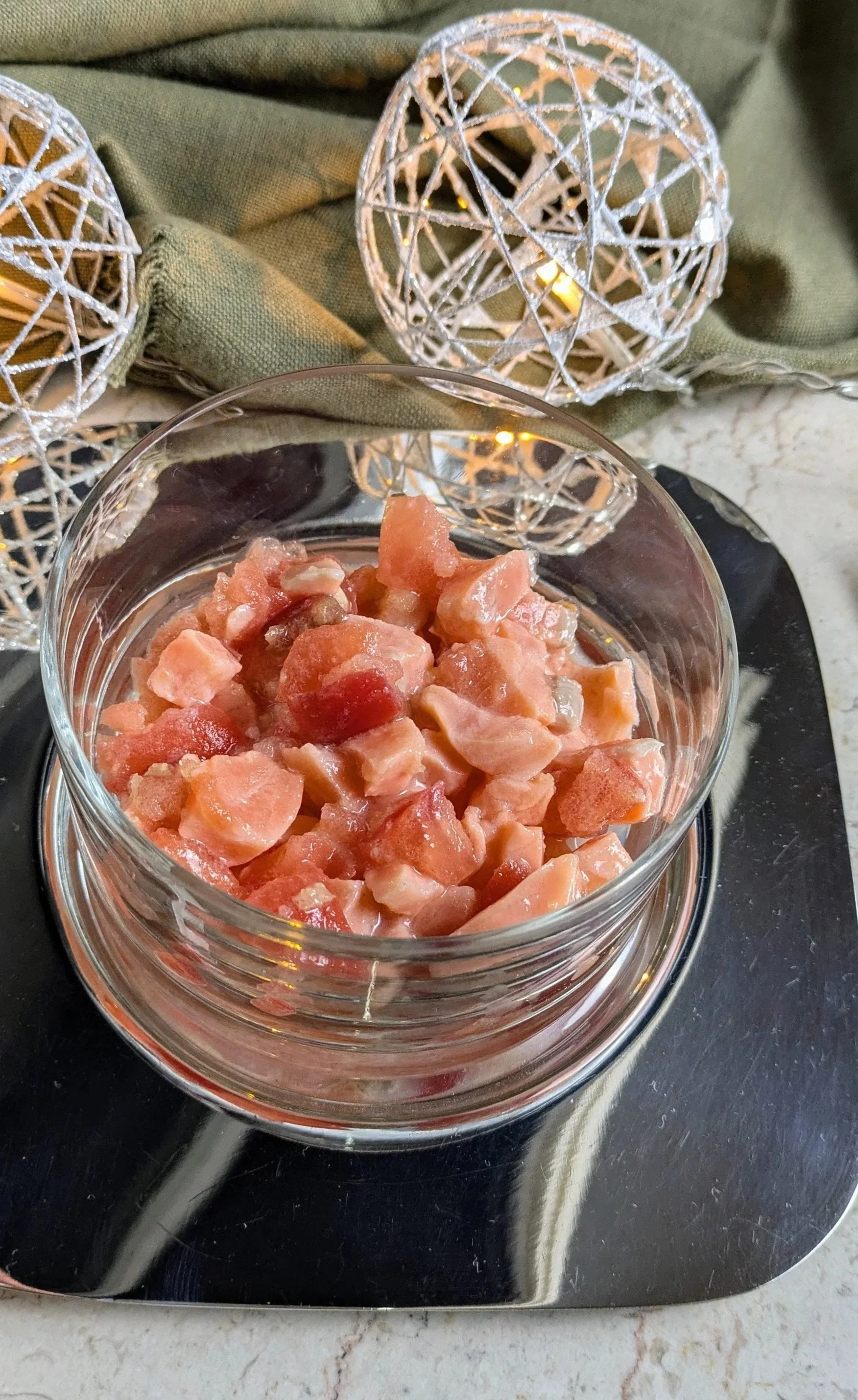Un peu de ciboulette est une jolie finition, mais personnellement je préfère ne pas ajouter cette saveur. Je sers donc ce tartare sans “finition”.